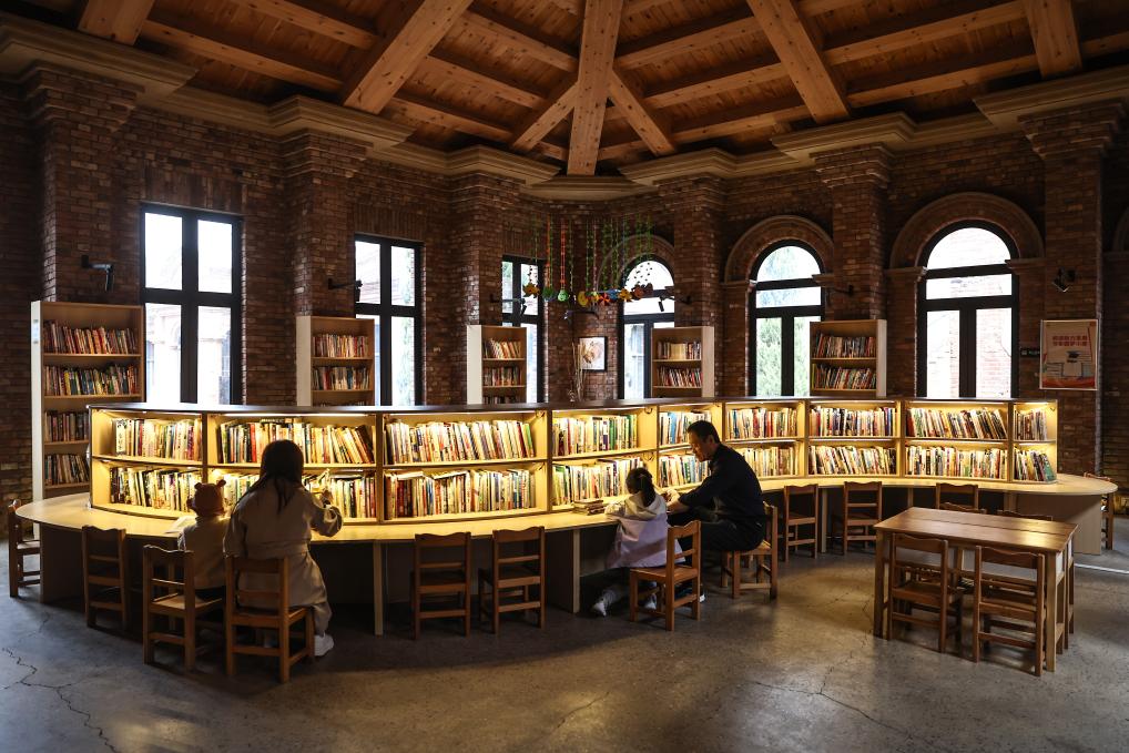 4月17日,小朋友在家長的陪同下在沈陽市鐵西區(qū)奉天工場文創(chuàng)園內的城市書房內讀書。新華社記者 潘昱龍 攝