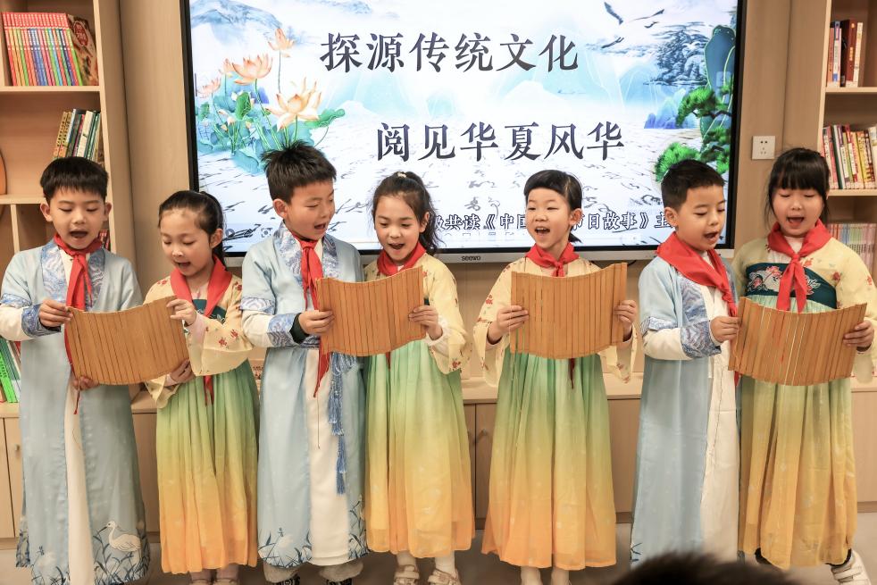 4月2日,湖北省武漢市洪山區(qū)未來實驗小學美林校區(qū)學生在吟誦古詩。新華社發(fā)(趙軍攝)