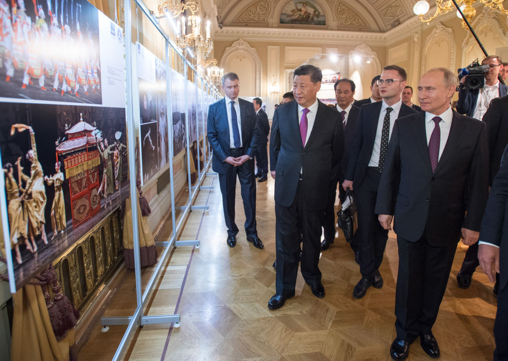 2019年6月5日,國家主席習(xí)近平和俄羅斯總統(tǒng)普京在莫斯科大劇院共同出席中俄建交70周年紀念活動。這是兩國元首共同參觀中俄建交70周年圖片展。