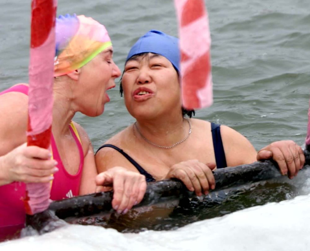 2002年1月15日,多次來華參加冬泳賽事的俄羅斯選手柳德米拉(左),在第二屆哈爾濱國際冬泳邀請賽上親吻老朋友、好姐妹——中國女隊員楊翠芬。
