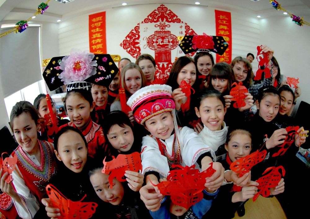 2008年12月30日,中俄學(xué)生在沈陽“莫斯科學(xué)生體驗中國冬令營”活動上展示自己的剪紙作品。