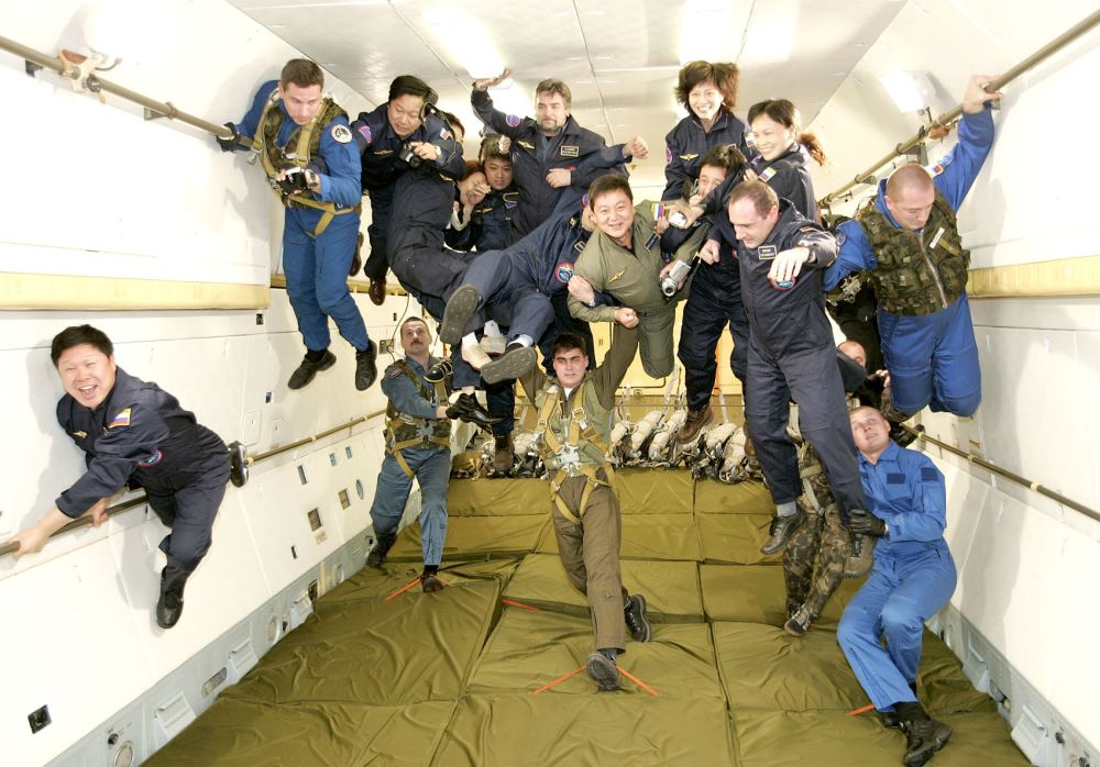 2004年12月17日,在俄羅斯首都莫斯科的加加林阿特拉斯宇航中心,10名中國游客在俄羅斯宇航員的保護下體驗太空失重訓(xùn)練。