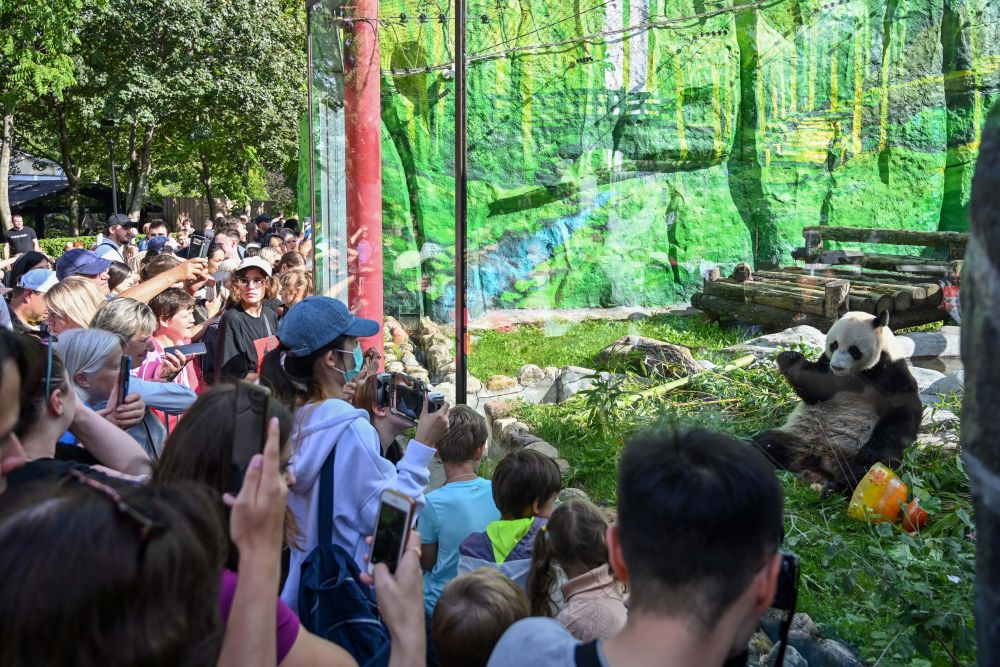 2024年7月31日,觀眾在俄羅斯莫斯科動物園拍攝大熊貓“如意”。當日,莫斯科動物園為來自中國的大熊貓“如意”慶祝生日。雄性大熊貓“如意”2016年7月31日出生于中國四川雅安碧峰峽基地,它和大熊貓“丁丁”于2019年4月29日抵達莫斯科,開啟為期15年的旅居生活。