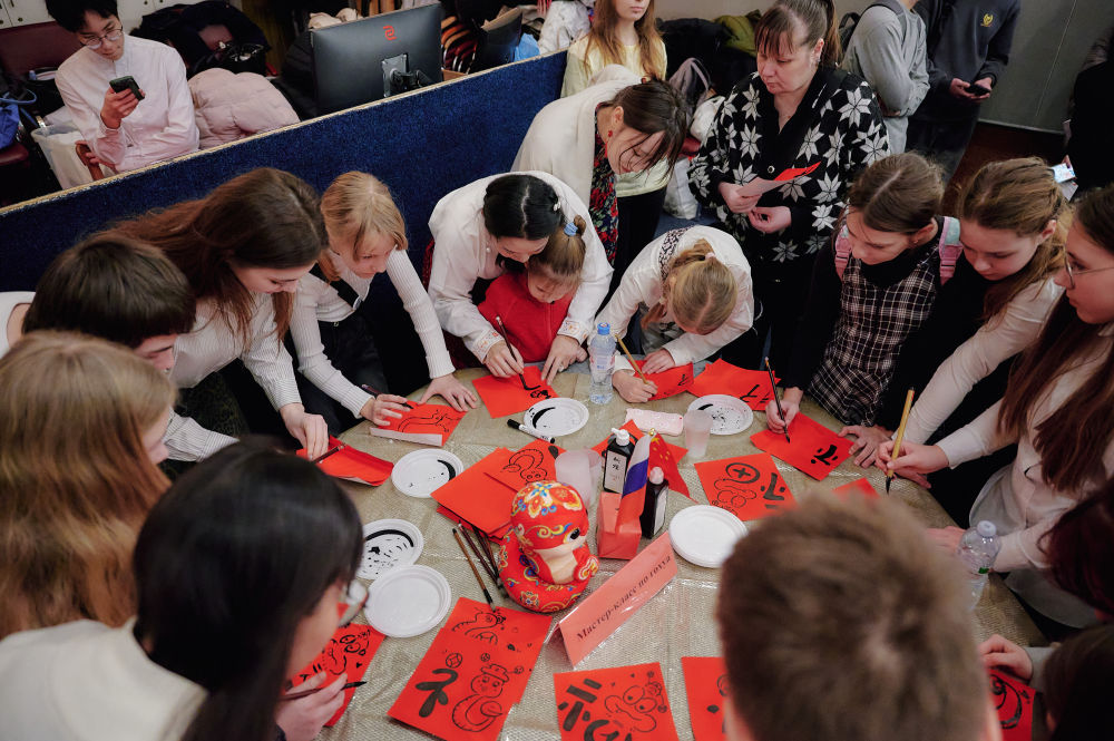 2025年2月3日,俄羅斯圣彼得堡學(xué)生在中小學(xué)春節(jié)聯(lián)歡節(jié)上體驗中國書法。