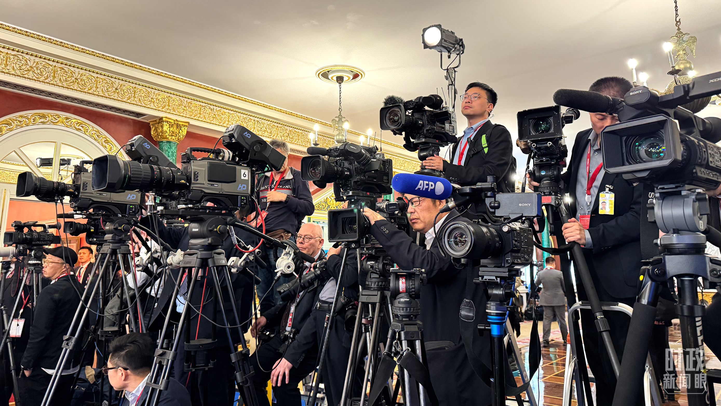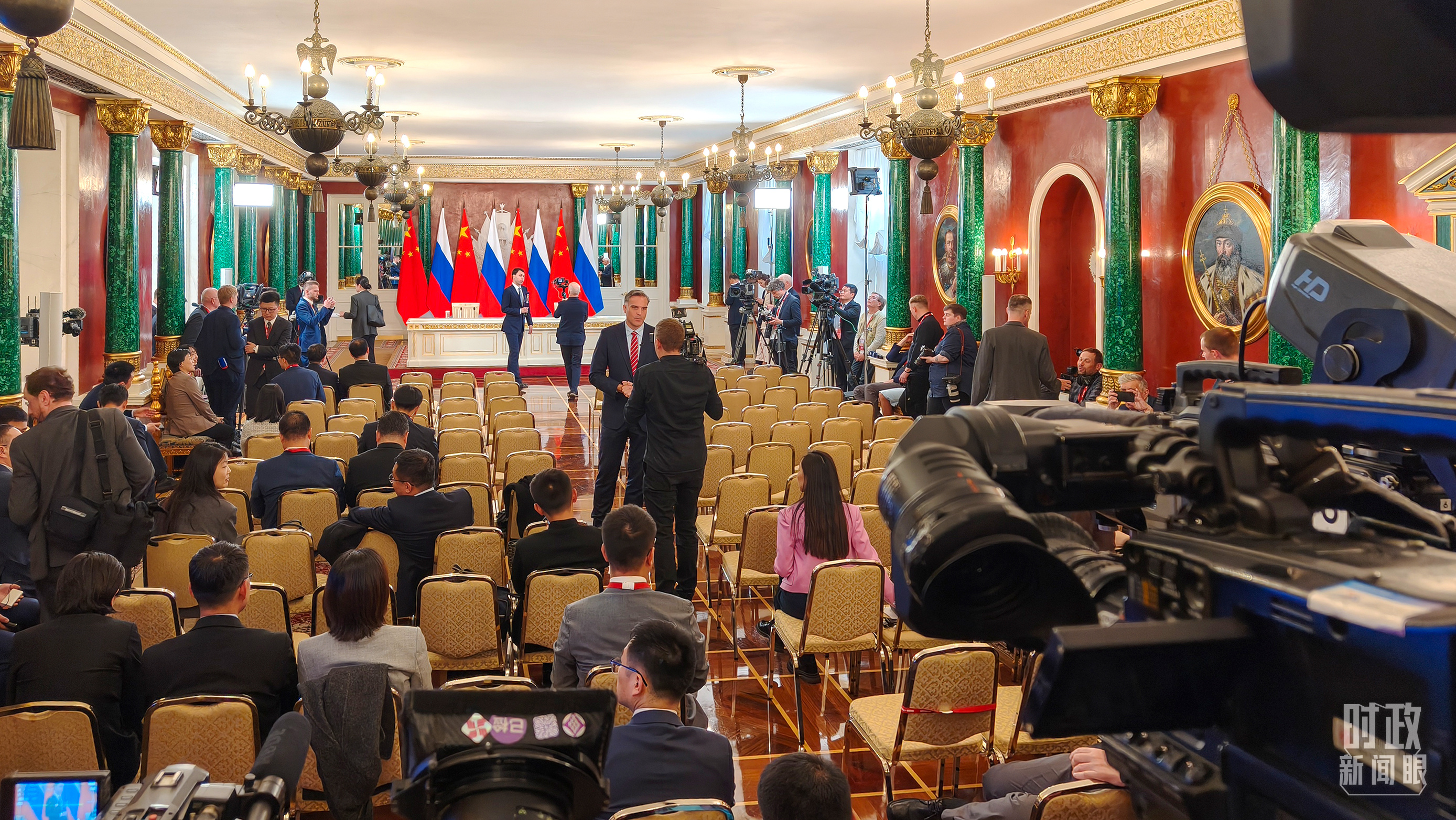 等待中俄兩國元首共見記者的中外媒體同仁。(總臺央視記者陸泓宇、蔣碩拍攝)