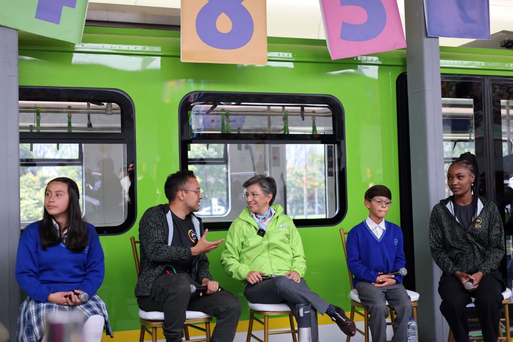 2023年8月10日,哥倫比亞波哥大市長克勞迪婭·洛佩斯(中)在波哥大地鐵的模型車廂旁跟參加活動的師生交流。按照計劃,由中企承建和運(yùn)營的波哥大地鐵一號線將在2028年正式投入運(yùn)營。