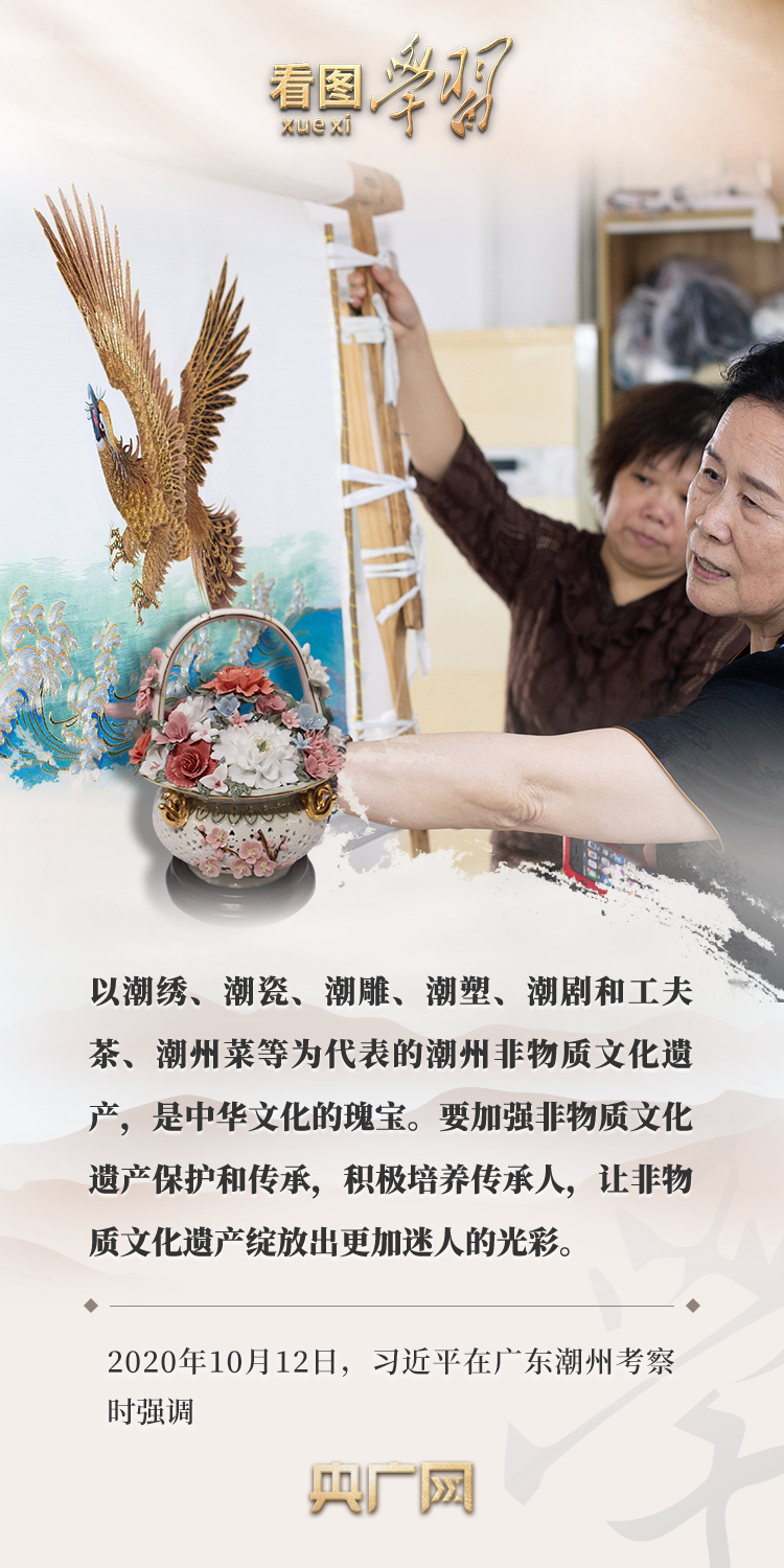 從古典民族史詩《格薩(斯)爾》到潮繡、潮瓷、潮劇和工夫茶,再到漢中藤編、常德絲弦……在各地考察調(diào)研時,習(xí)近平總書記曾多次就文化傳承發(fā)展、非物質(zhì)文化遺產(chǎn)保護作出重要指示,強調(diào)要“讓非物質(zhì)文化遺產(chǎn)綻放出更加迷人的光彩”。