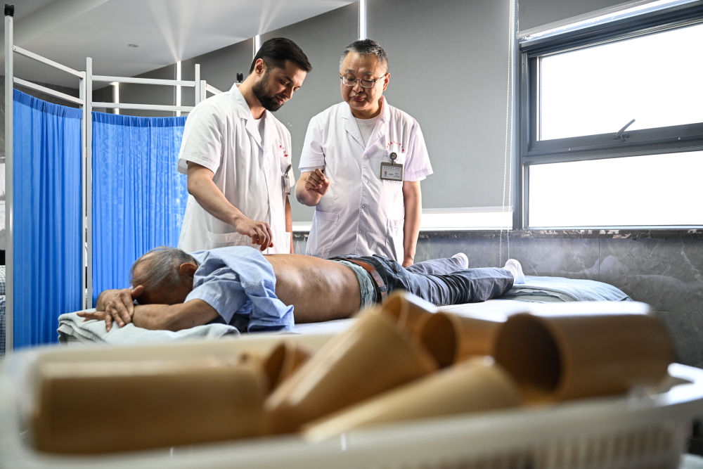 2025年4月18日,在南京中醫(yī)藥大學(xué)第二附屬醫(yī)院針灸康復(fù)科,李小龍(后左)在導(dǎo)師張建斌指導(dǎo)下給患者行針。南京中醫(yī)藥大學(xué)2023級針灸推拿專業(yè)的碩士研究生阿米爾中來自塔吉克斯坦首都杜尚別。中學(xué)時(shí),他愛上了中國文化,給自己取了個(gè)中文名字“李小龍”。他刻苦學(xué)習(xí)中文,參加漢語橋中學(xué)生中文比賽,后來多次來到中國,與中醫(yī)結(jié)緣。2015年,李小龍到北京中醫(yī)藥大學(xué)學(xué)習(xí)針灸推拿,畢業(yè)后回到杜尚別開了自己的中醫(yī)診所。2023年,為了進(jìn)一步提升自己,李小龍來到南京中醫(yī)藥大學(xué)攻讀碩士研究生。“今后,我希望把中醫(yī)帶到更多的國家,讓更多人感受中醫(yī)的妙處。”