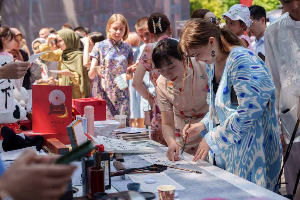 2025年4月19日,在哈薩克斯坦阿拉木圖,一名中國文化愛好者在“國際中文日”慶祝活動(dòng)上體驗(yàn)書法。