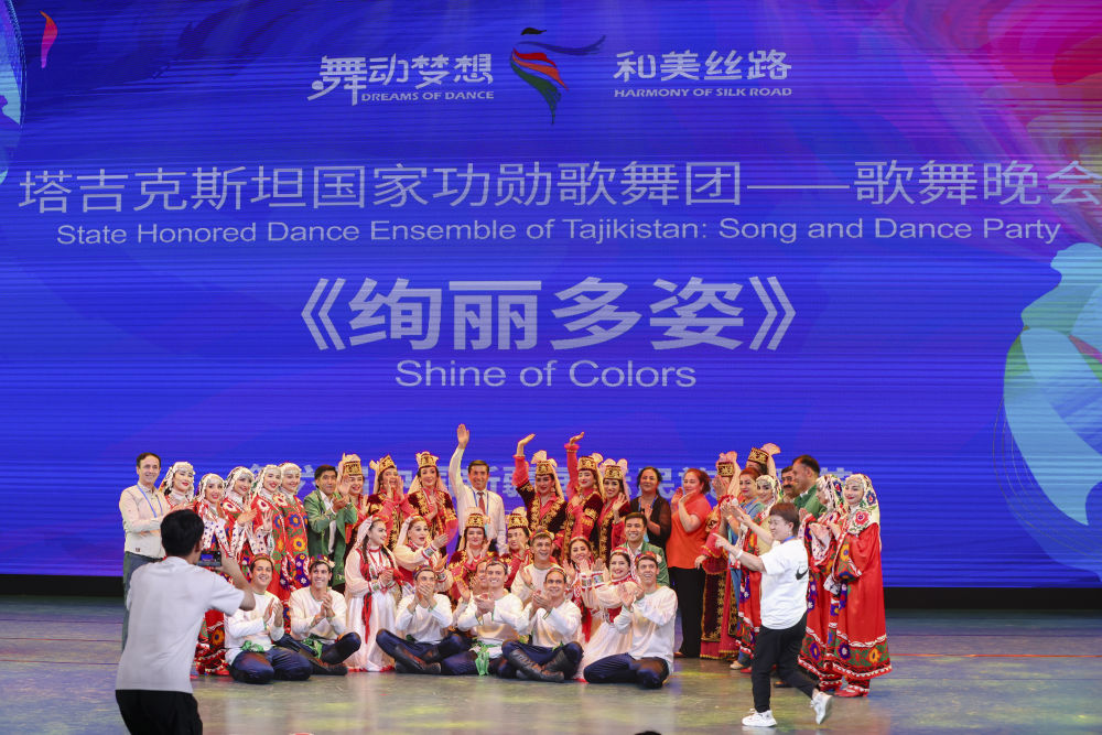 2023年7月27日,由塔吉克斯坦羅拉國家功勛歌舞團(tuán)帶來的歌舞晚會(huì)《絢麗多姿》在新疆烏魯木齊晚報(bào)劇院上演。這是演員在演出結(jié)束后合影留念。
