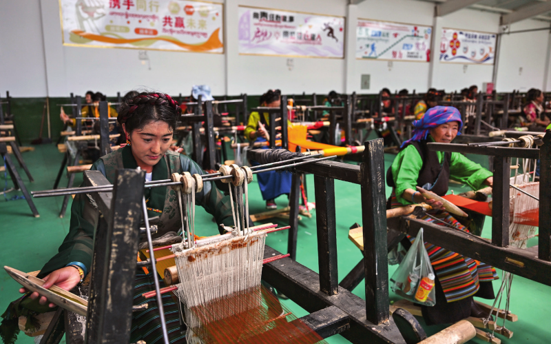 在西藏日喀則市仁布縣特色產(chǎn)業(yè)孵化園,亞德細褐羊毛織品農(nóng)民專業(yè)合作社工作人員在車間里織布(2024年9月1日攝)孫瑞博攝/本刊