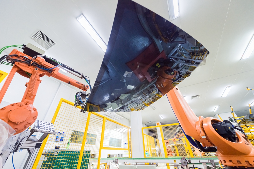 機械臂在福耀汽車玻璃智能工廠的車間生產(chǎn)玻璃產(chǎn)品