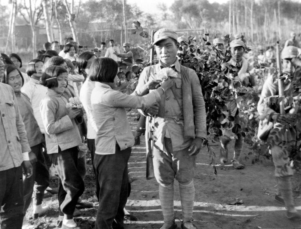 這是老百姓為百團(tuán)大戰(zhàn)勝利歸來的英雄佩戴光榮花(中國照片檔案館館藏)。