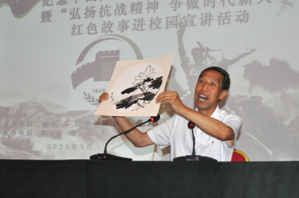出生在陽泉市正太鐵路破襲戰(zhàn)沿線區(qū)域的姚永田,從小聽抗戰(zhàn)故事長大。他利用課余時(shí)間研究家鄉(xiāng)抗戰(zhàn)史、編寫校本教材,并在校園義務(wù)宣講紅色故事100余場,努力讓紅色精神在年輕一代心中生根發(fā)芽。這是2025年5月26日,姚永田在陽泉市第六中學(xué)為學(xué)生們宣講。