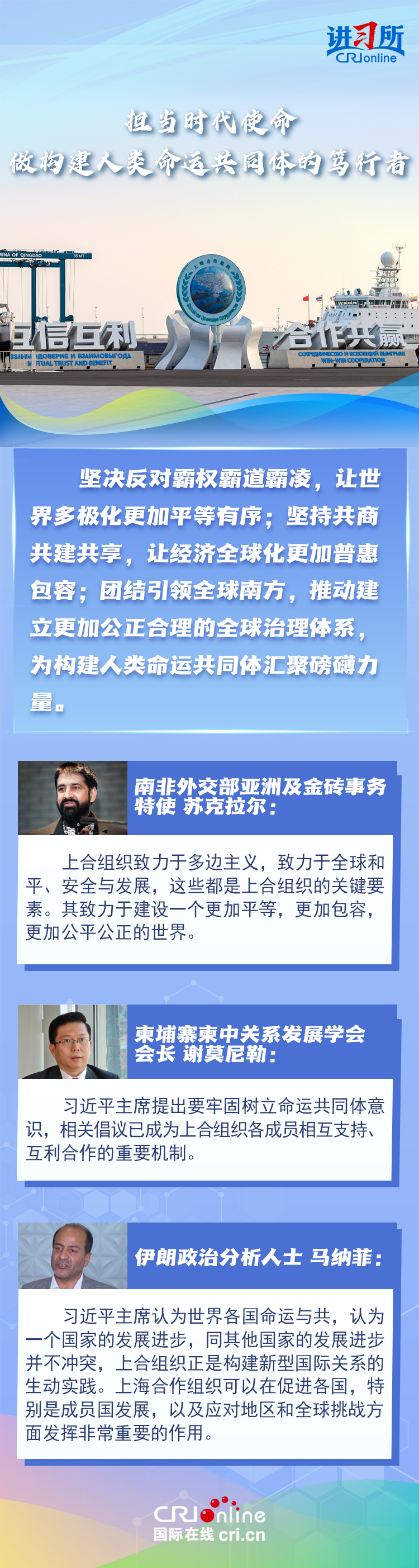 “讓‘上海精神’持續(xù)照亮構(gòu)建上海合作組織命運(yùn)共同體之路。”上海合作組織成立24年來(lái),始終秉持“上海精神”,成功走出了一條順應(yīng)時(shí)代潮流、契合各方需求的區(qū)域合作道路,樹(shù)立起新型國(guó)際關(guān)系的典范。在國(guó)際人士眼中,上海合作組織站在歷史正確一邊,致力于建設(shè)一個(gè)更加平等,更加包容,更加公平公正的世界,對(duì)維護(hù)地區(qū)和全球和平至關(guān)重要。