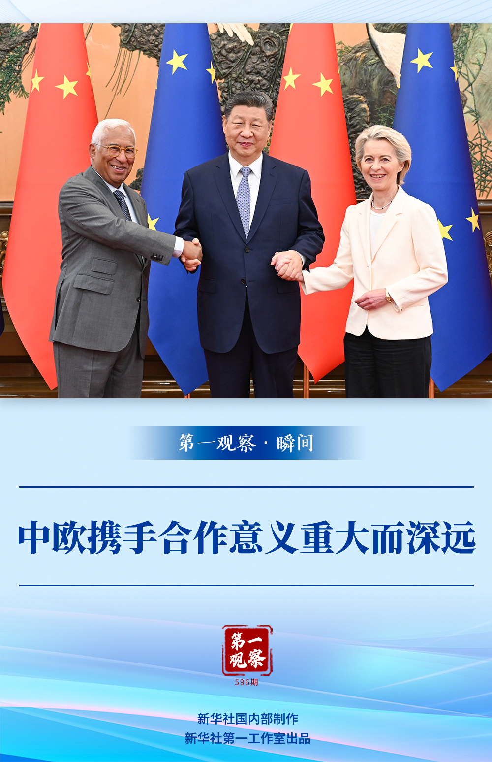 會(huì)見(jiàn)開(kāi)始前的合影環(huán)節(jié),科斯塔主席、馮德萊恩主席主動(dòng)向習(xí)近平主席伸出右手,三位領(lǐng)導(dǎo)人微笑著攜手面向記者合影留念。