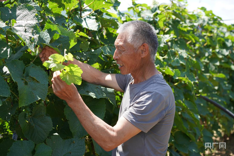 張國利為葡萄藤疏除過密枝條(央廣網(wǎng)記者 李春雪 攝)