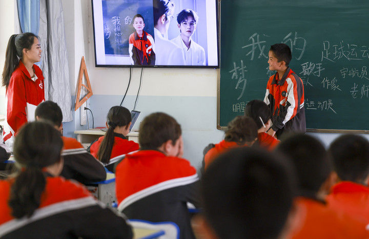 新疆克孜勒蘇柯爾克孜自治州阿圖什市哈拉峻鄉(xiāng)謝依特小學(xué),是一所主要面向柯爾克孜族學(xué)生的村級小學(xué),2022年8月成為該州首個西部計劃志愿者包校支教的試點學(xué)校。23名戍邊支教西部計劃志愿者服務(wù)隊的志愿者,在這所小學(xué)承擔(dān)著教書育人的工作。經(jīng)過近三年的支教服務(wù),學(xué)生的學(xué)習(xí)成績顯著提高,得到當(dāng)?shù)貜V泛認可。這是2025年4月23日,支教教師高淑賢(左一)在班級里展示她為學(xué)生們制作的“AI夢想職業(yè)照”。