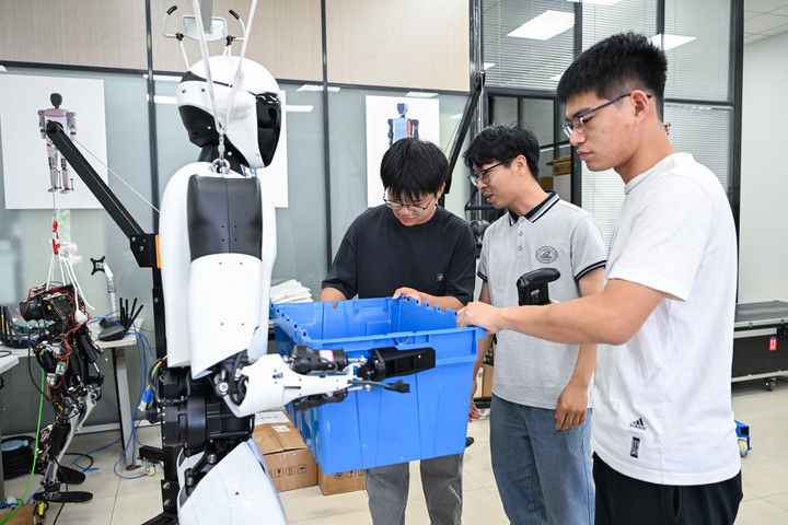 近年來,湖北省加快布局人形機器人領(lǐng)域,依托省內(nèi)高校院所的人才優(yōu)勢和創(chuàng)新體系優(yōu)勢,組織武漢大學(xué)、華中科技大學(xué)等參與人形機器人相關(guān)項目研發(fā),集中推出“天問”“勞動者”“荊楚”等一系列人形機器人。這是2025年5月29日,在華中科技大學(xué)機械科學(xué)與工程學(xué)院,博士研究生丁濤(右二)和團隊成員測試“荊楚”人形機器人的搬運能力。