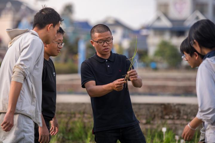 今年37歲的黃光福是云南大學(xué)農(nóng)學(xué)院的一名青年教師,同時也是云南大學(xué)在云南省勐??h勐遮鎮(zhèn)曼恩村成立的多年生稻科技小院的負責(zé)人。多年來,他帶領(lǐng)學(xué)生扎根田間,進行技術(shù)攻關(guān)。團隊利用長雄野生稻特有的地下莖無性繁殖能力,成功培育出“云大25”“云大107”等新品種,突破性地實現(xiàn)水稻“一次栽種、連續(xù)收割”,讓“割韭菜般收稻子”的農(nóng)業(yè)成果從實驗室走向田間地頭。這是2025年2月27日,青年教師黃光福(中)在試驗田間給學(xué)生授課。