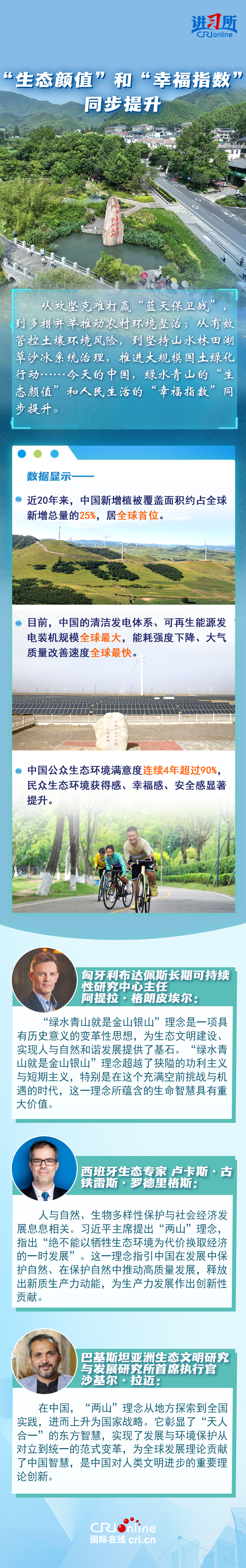 “從歷史長(zhǎng)河來(lái)看,如果說我們這一代人能留給后人點(diǎn)什么,我看生態(tài)文明建設(shè)就是很重要的一個(gè)方面。生態(tài)文明建設(shè)最能給老百姓帶來(lái)獲得感,環(huán)境改善了,老百姓體會(huì)也最深。”20年前,時(shí)任中共浙江省委書記的習(xí)近平在安吉余村考察時(shí),肯定了余村下定決心關(guān)閉礦區(qū)、全面走綠色發(fā)展之路的做法,并首次提出“綠水青山就是金山銀山”重要理念,20年來(lái),這一重要理念帶給中國(guó)大地一場(chǎng)革命性變化,直接推動(dòng)美麗中國(guó)建設(shè)取得歷史性成就。