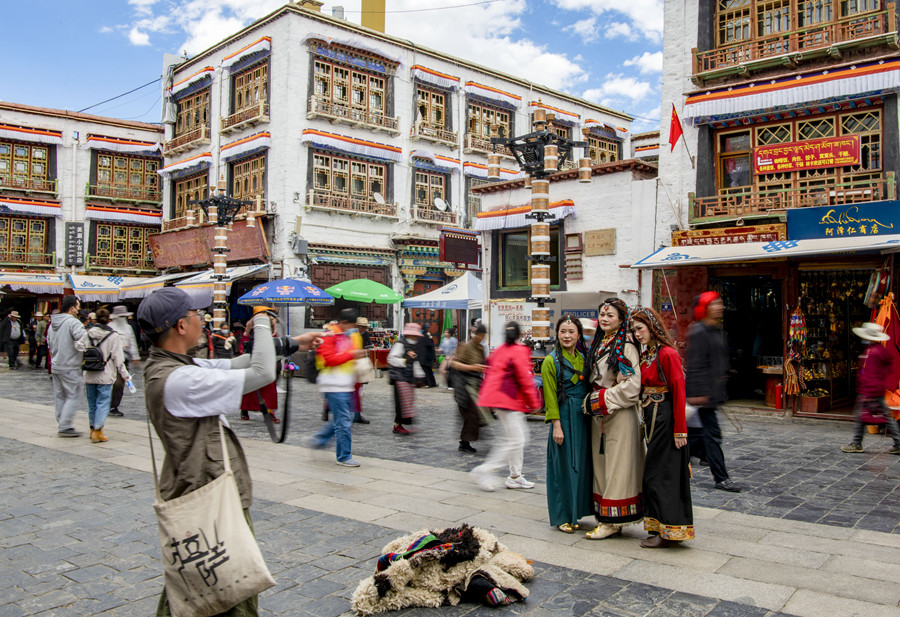 游客身著藏裝在拉薩八廓街拍照留念(2023年6月13日攝)。新華社記者 姜帆 攝