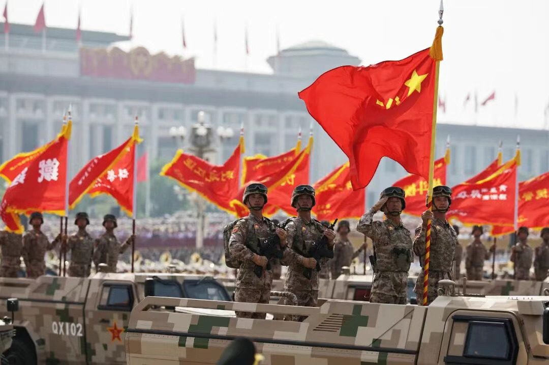 80面抗戰(zhàn)英模部隊(duì)榮譽(yù)旗幟組成戰(zhàn)旗方隊(duì)