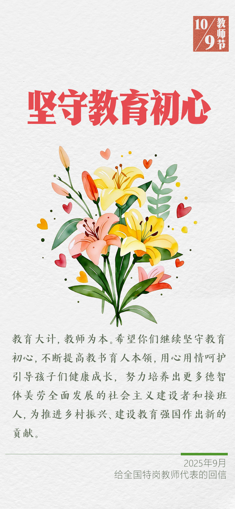 在第四十一個教師節(jié)到來之際,習(xí)近平總書記給全國特崗教師代表回信,提出殷切希望,并向全國廣大教師和教育工作者致以節(jié)日祝賀和誠摯問候。
