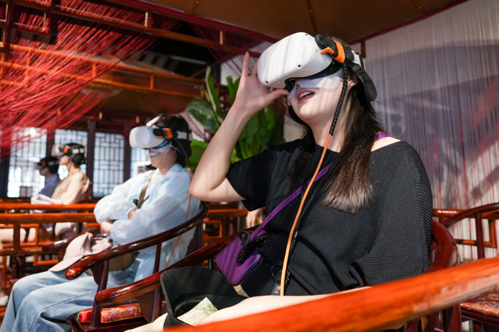 2025年5月18日,游客在江蘇蘇州拙政園體驗(yàn)VR漫游。近年來,蘇州不斷推進(jìn)“數(shù)字園林”建設(shè),在園林整體數(shù)字建模、園林要素?cái)?shù)據(jù)庫建設(shè)等方面開展探索,利用數(shù)字技術(shù)創(chuàng)造“數(shù)字云游”VR場(chǎng)景,打造“云游拙政園”“獅林園宇宙”“留園虛擬元宇宙”等項(xiàng)目,營造真實(shí)可感的虛擬空間,讓觀眾沉浸式感受蘇州園林的獨(dú)特魅力。