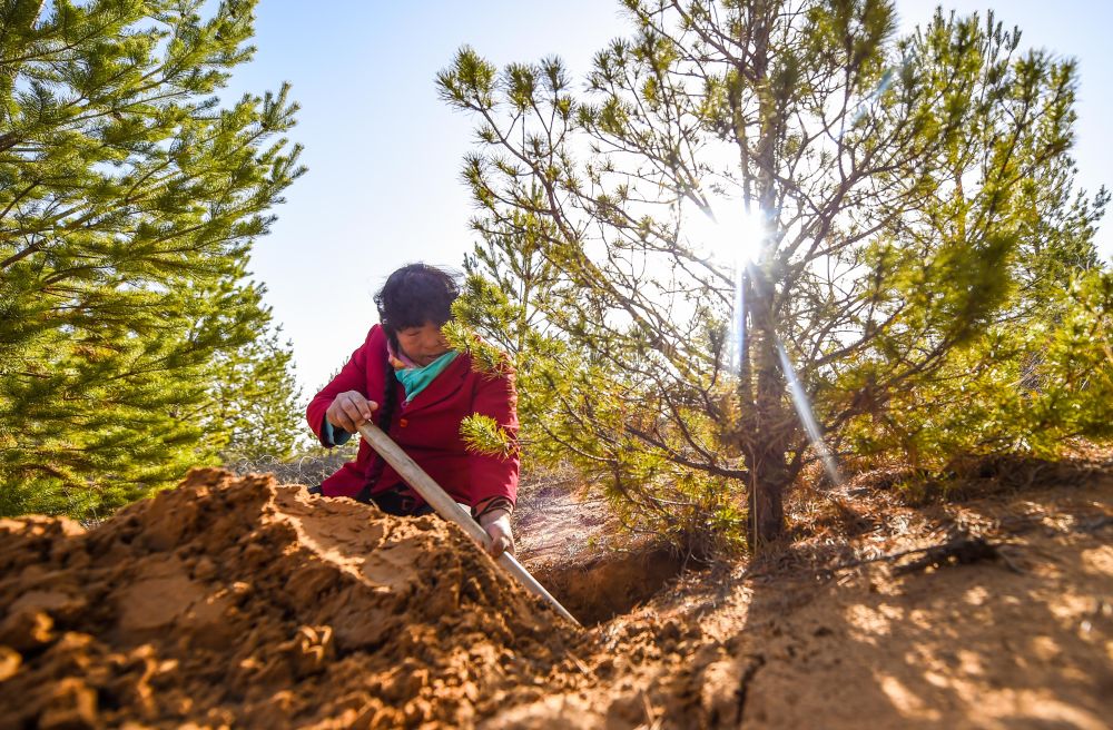 2021年3月23日,殷玉珍在內(nèi)蒙古毛烏素沙漠挖土,查看松樹根部的生長(zhǎng)情況。20世紀(jì)80年代,殷玉珍嫁到這片沙地時(shí),眼前只有漫無(wú)邊際的黃沙。1986年,她埋下第一棵樹苗,從此與風(fēng)沙較勁。如今,7萬(wàn)多畝荒沙披上了綠裝,治理好的土地上種起了小米,金燦燦的谷穗成了“沙漠黃金”。