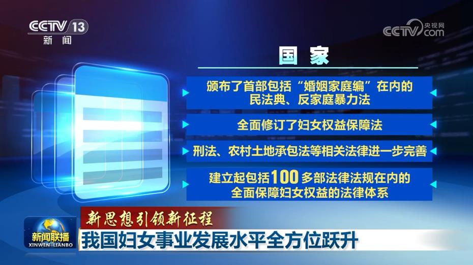新時(shí)代,保障婦女權(quán)益作為國家意志充分彰顯,法治保障體系更加完善。國家頒布了首部包括“婚姻家庭編”在內(nèi)的民法典、反家庭暴力法,全面修訂了婦女權(quán)益保障法,刑法、農(nóng)村土地承包法等相關(guān)法律進(jìn)一步完善,建立起包括100多部法律法規(guī)在內(nèi)的全面保障婦女權(quán)益的法律體系。
