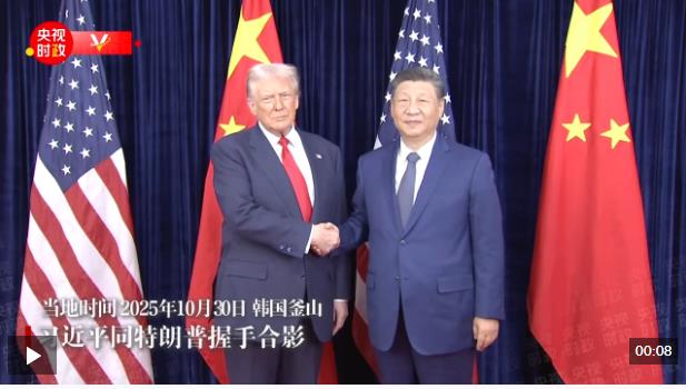 當(dāng)?shù)貢r間10月30日中午,中美元首會晤開始前,習(xí)近平同特朗普握手合影。