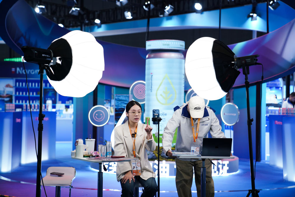 2025年11月4日,工作人員在第八屆進博會醫(yī)療器械及醫(yī)藥保健展區(qū)直播。本屆進博會直播密度大、形式多樣,有的展位專門搭建直播區(qū)域,燈光、背景、展板一應(yīng)俱全;有的展位手機一架、產(chǎn)品一擺,直播就地開始;還有的直播間是“流動的”,達(dá)人主播們拿著手機、別著麥克風(fēng),穿梭于各個品牌展位間現(xiàn)場推薦……八年來,進博會影響力逐年遞增,越來越多的中國消費者愿意通過直播了解進博會上的“全球好物”。