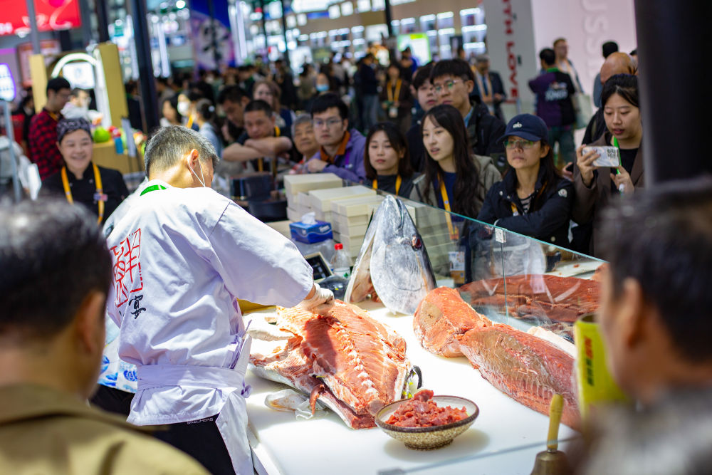 2025年11月7日,在第八屆進博會農(nóng)食產(chǎn)品展區(qū),參觀者在一處展臺觀看開魚秀。工作人員當(dāng)場分切一條超過100公斤的金槍魚。英國奶酪、法國葡萄酒、意大利黑醋、馬來西亞榴蓮、厄瓜多爾巧克力、新西蘭乳制品、阿根廷牛肉……在本屆進博會農(nóng)食產(chǎn)品展區(qū),多款“洋特產(chǎn)”亮相,展商現(xiàn)場加工、制作食品,供參觀者品嘗。
