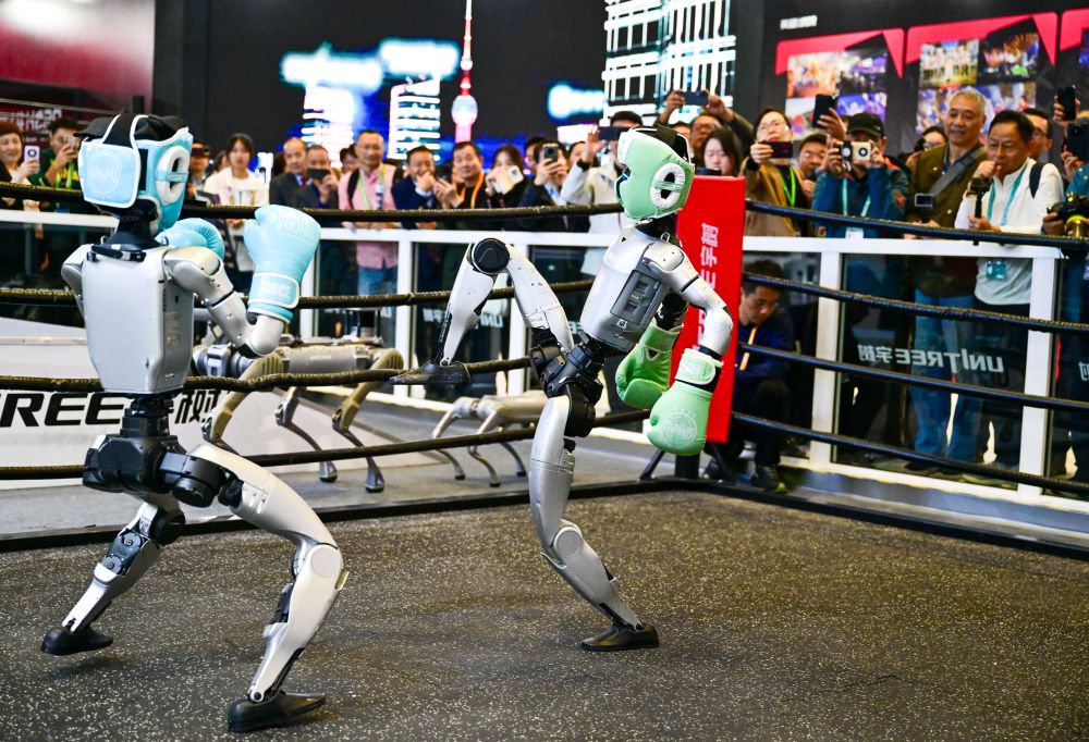 2025年11月6日,人形機器人在第八屆進博會宇樹科技展臺進行格斗表演。當(dāng)日,在技術(shù)裝備展區(qū)宇樹科技展臺,兩臺G1人形機器人的格斗表演吸引了眾多觀眾。它們戴著護具及拳套,施展直拳、勾拳、左右鞭腿,展示倒地自主起身等復(fù)雜動作,不時贏得觀眾喝彩。
