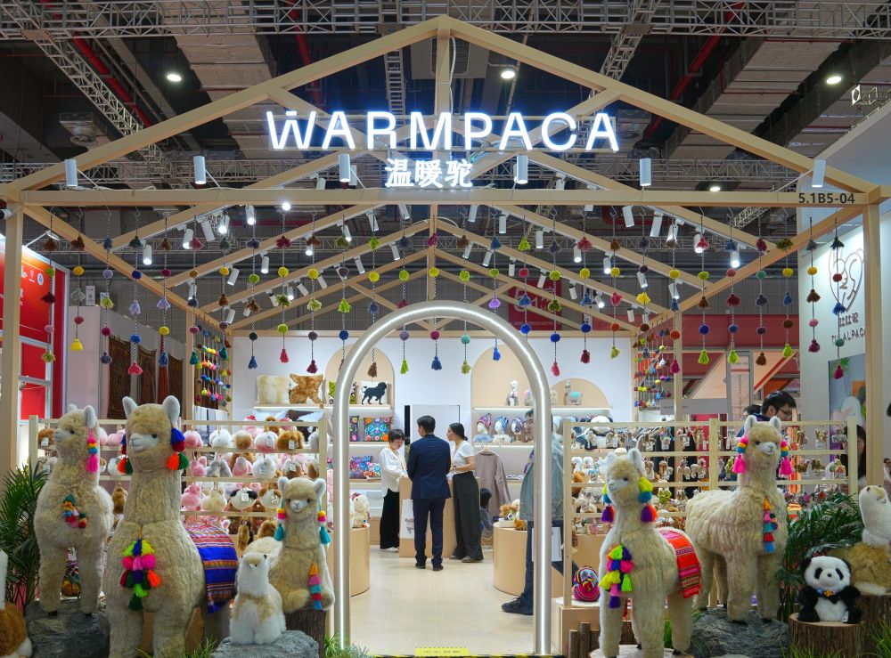 2025年11月5日在第八屆進博會消費品展區(qū)拍攝的“溫暖駝”展臺。從秘魯阿雷基帕的小店,到進博會的展臺,再到全球消費者手中,進博會為“溫暖駝”帶來了巨大的發(fā)展機遇。本屆進博會,“溫暖駝”展位面積已從2018年首屆進博會的9平方米拓展至54平方米,并在上海、廈門等地開設(shè)6家門店。源自進博會的“溫暖駝”訂單不僅助力秘魯200多個家庭脫貧,還倒逼一場“品質(zhì)革命”,讓羊駝玩偶制作對標(biāo)世界標(biāo)準(zhǔn)。