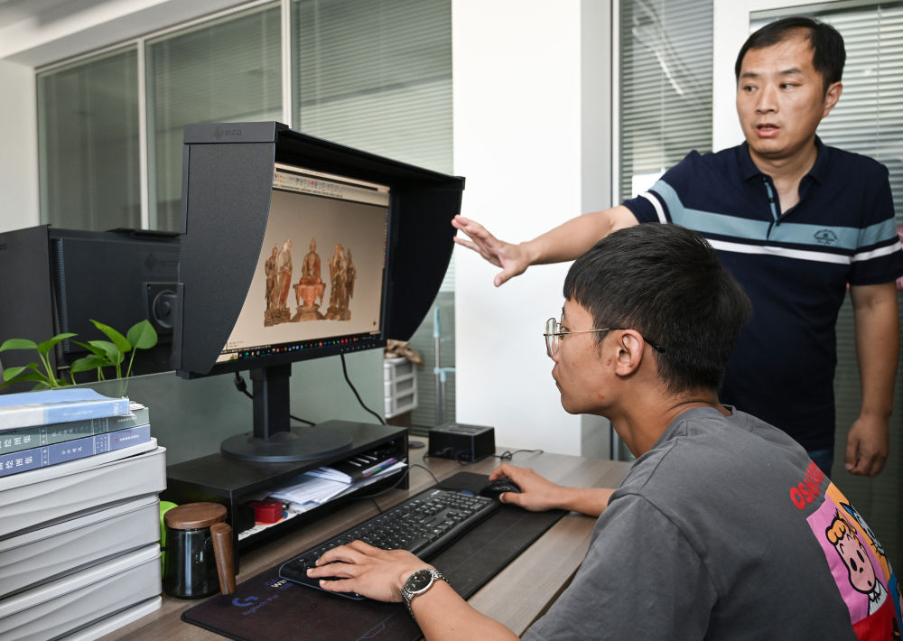 2023年8月3日,敦煌研究院文物數字化研究所的工作人員在展示莫高窟彩塑三維重建的成果。近年來,敦煌研究院持續(xù)加大文物保護基礎研究和應用研究,不斷加強文物科技保護力度,提升科研平臺建設,為文物保護和文化遺產事業(yè)發(fā)展奠定良好基礎。