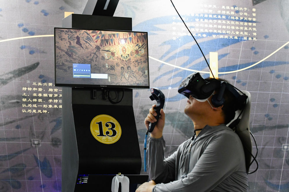 2024年7月22日,一名游客在敦煌莫高窟“尋境敦煌——數字敦煌沉浸展”上借助VR設備沉浸式游覽莫高窟第285窟虛擬場景?!皩ぞ扯鼗汀本C合運用了VR虛擬現(xiàn)實、三維建模、游戲引擎的物理渲染和全局動態(tài)光照等新技術,高精度立體還原了莫高窟第285窟。游客戴上VR眼鏡,不僅可以零距離觀賞壁畫、360度自由探索洞窟細節(jié),還能“飛升”到窟頂,身臨其境參與壁畫故事情節(jié),沉浸式感受敦煌文化的魅力。