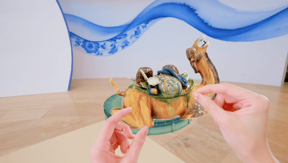 “這款MR眼鏡使用的就是3D技術(shù),該技術(shù)能夠清晰地將文物的紋飾紋樣、顏色、形制等信息采集下來。戴上MR眼鏡后,觀眾能夠放大縮小、旋轉(zhuǎn)文物,增強(qiáng)了觀看體驗?!崩钤凑f。