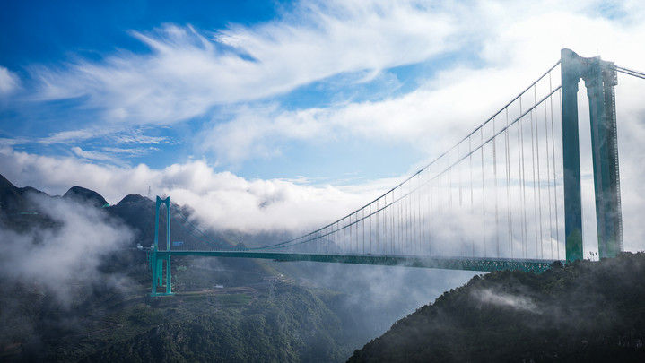 2025年9月28日,世界第一高橋——貴州花江峽谷大橋建成通車。花江峽谷大橋是貴州六枝至安龍高速公路的控制性工程,大橋全長2890米,主跨徑1420米,是目前世界山區(qū)峽谷第一大跨度鋼桁梁懸索橋;其橋面距水面垂直高度625米,是新的世界第一高橋。