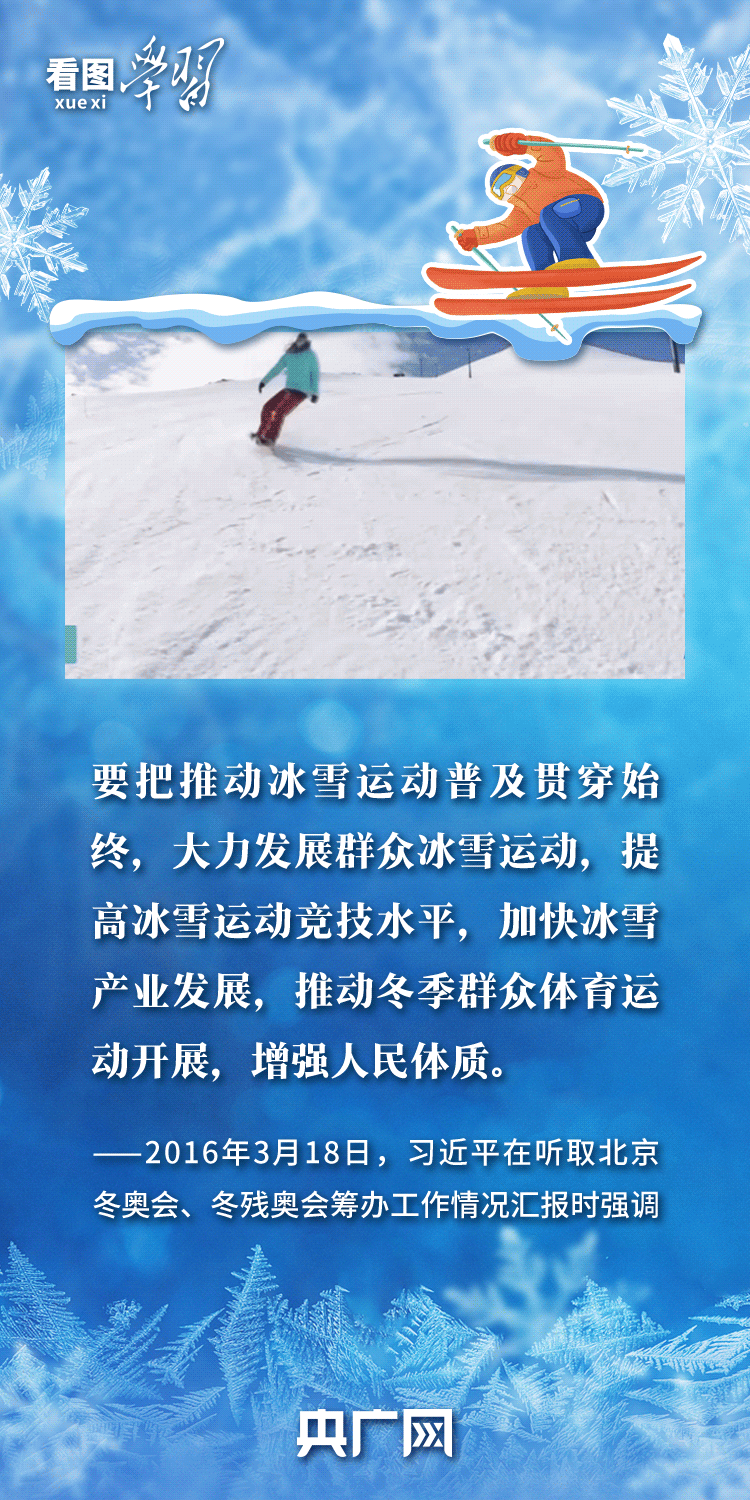 “人生幸??鞓?lè),強(qiáng)身健體十分重要?!币恢币詠?lái),習(xí)近平總書(shū)記高度重視我國(guó)冰雪運(yùn)動(dòng)發(fā)展,強(qiáng)調(diào)要大力發(fā)展群眾冰雪運(yùn)動(dòng),提高冰雪運(yùn)動(dòng)競(jìng)技水平,加快冰雪產(chǎn)業(yè)發(fā)展,推動(dòng)冬季群眾體育運(yùn)動(dòng)開(kāi)展,增強(qiáng)人民體質(zhì)。