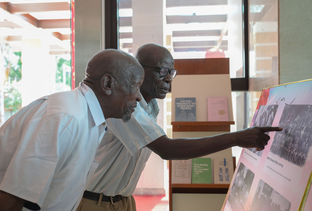 1月28日,在津巴布韋首都哈拉雷的中國大使館,兩名曾在中國接受培訓(xùn)的津巴布韋老戰(zhàn)士在展板老照片上尋找自己。當(dāng)日,大使館舉行向津巴布韋解放斗爭老戰(zhàn)士轉(zhuǎn)交習(xí)近平主席復(fù)信活動。新華社記者 楊光 攝