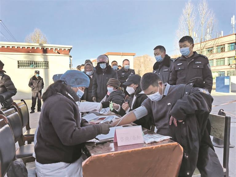 自2021年1月1日起,拉薩市在各縣(區(qū))設(shè)置26個(gè)新冠疫苗接種點(diǎn),按照知情同意、自愿接種的原則,優(yōu)先對(duì)重點(diǎn)人群進(jìn)行疫苗接種工作。圖為1日上午,在達(dá)孜區(qū)人民醫(yī)院,醫(yī)護(hù)人員正在對(duì)公安干警及群眾進(jìn)行血壓檢測(cè)和詢問既往病史等,并與他們簽訂新冠病毒疫苗接種同意書。拉薩融媒記者 范江英攝