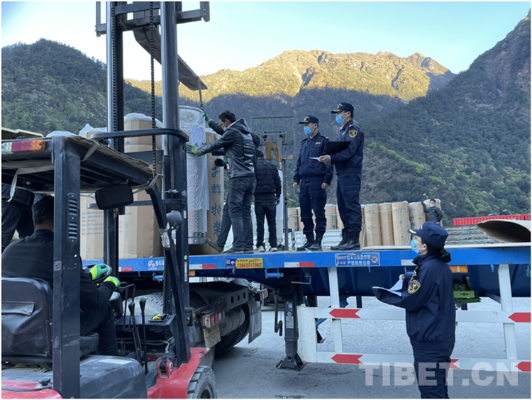 圖為聶拉木海關(guān)關(guān)員正在對(duì)援尼物資進(jìn)行現(xiàn)場(chǎng)監(jiān)管