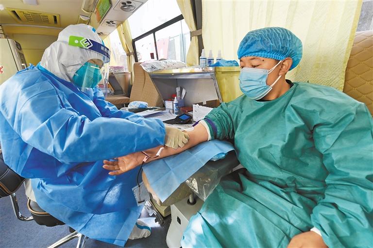 近日,西藏自治區(qū)無償獻血委員會向全區(qū)各級黨政機關(guān)、企事業(yè)單位、民間社會組織和社會各界愛心人士發(fā)出《致全區(qū)人民無償獻血倡議書》, 西藏各族各界干部群眾積極響應,踴躍參與無償獻血,奉獻愛心,傳遞正能量。 圖為醫(yī)護人員在采集血液。 記者 唐斌 攝