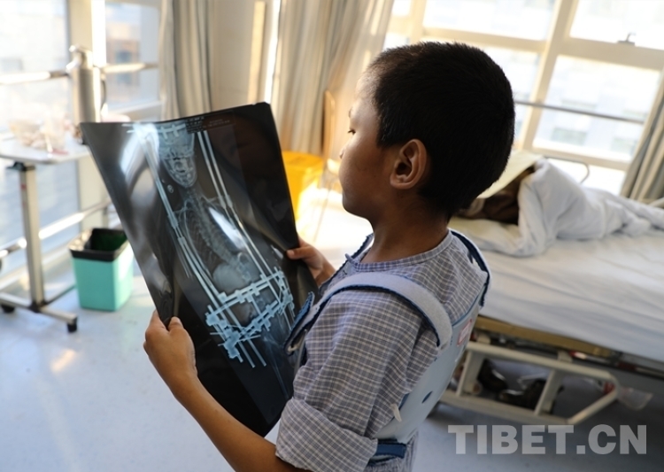 病房?jī)?nèi),9歲的扎西曲培已經(jīng)完成了手術(shù),在病房里奔走玩耍。他煞有介事地拿起自己的x光片,說“這是我的,快治好的。”李淳德說,“這個(gè)小男孩調(diào)皮得很,天天很活躍,眼睛里都是機(jī)靈。剛來的時(shí)候他肩膀一個(gè)高一個(gè)低,肩胛骨也不對(duì)稱,如今走路的時(shí)候形態(tài)完全正常,身高長(zhǎng)了12公分,因?yàn)槟挲g小,將來恢復(fù)估計(jì)會(huì)更好一些?!?/p>