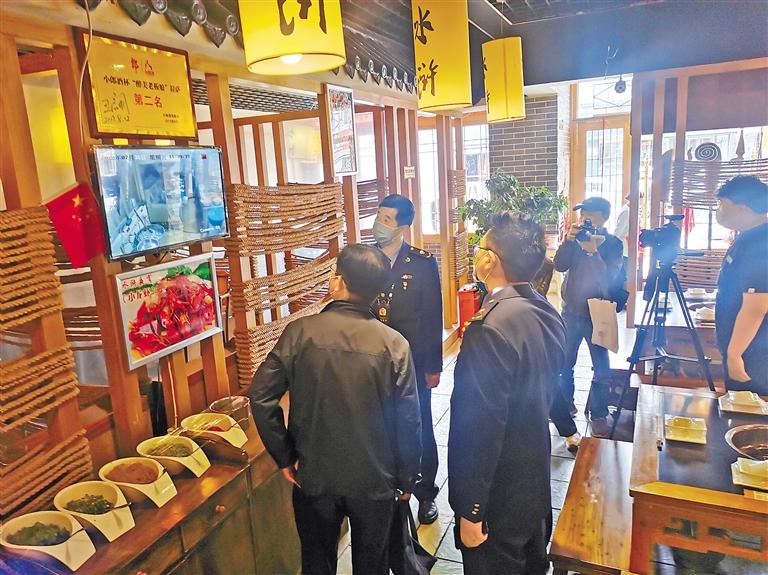 拉薩市市場(chǎng)監(jiān)管局及相關(guān)部門(mén)組成檢查組在某餐廳查看“明廚亮灶”情況。