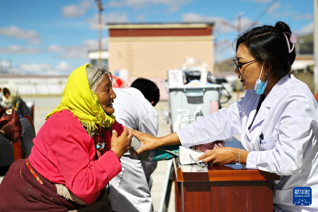 8月18日,在阿里地區(qū)措勤縣曲洛鄉(xiāng),鄉(xiāng)衛(wèi)生院醫(yī)生巴桑卓瑪為一名老人測量血壓。新華社記者 張汝鋒 攝
