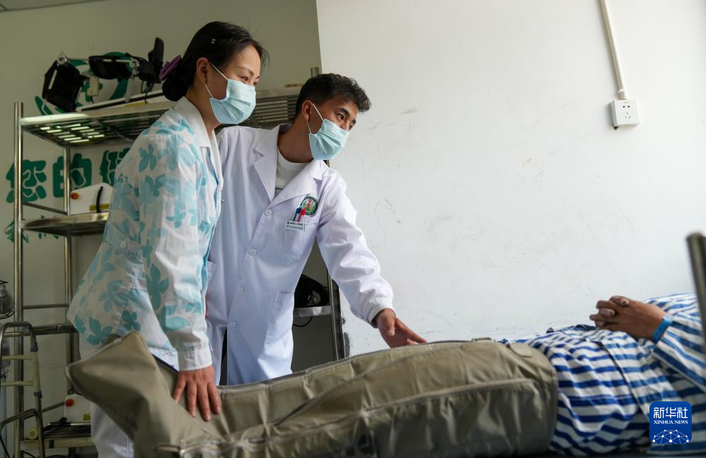 在昌都市洛隆縣人民醫(yī)院,從西藏大學醫(yī)學院畢業(yè)的醫(yī)生巴桑扎西和護士為患者進行康復(fù)治療(7月21日攝)。新華社記者 晉美多吉 攝 ??