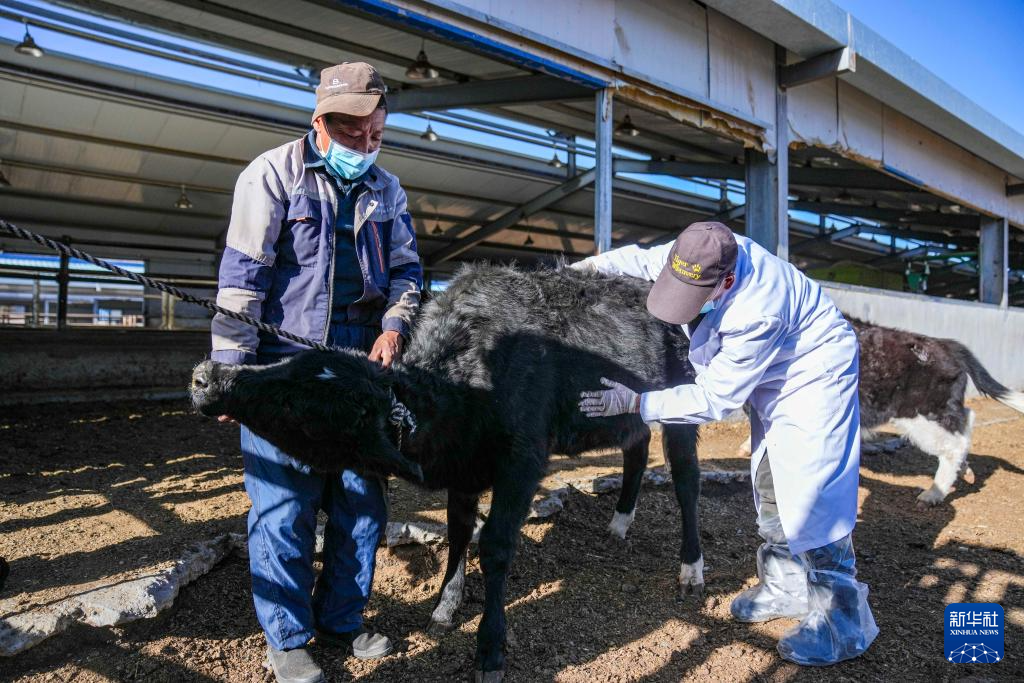 12月3日,西藏自治區(qū)動(dòng)物疫病預(yù)防控制中心(區(qū)畜牧總站)曲水實(shí)驗(yàn)站的工作人員在檢查克隆樟木牛母犢的身體狀況。新華社記者 丁增尼達(dá) 攝